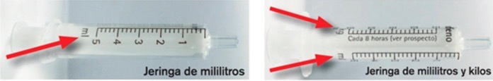 - Fíjarse bien en la escala que tiene la jeringa antes de cargar el medicamento ya que algunas vienen en mililitros y otras en mililitros y kilogramos. No confundas las escalas.