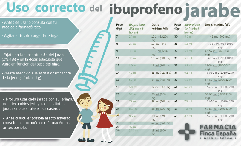 - Revisar la concentración de ibuprofeno del jarabe, ya que la cantidad a suministrar depende de ella. Esta tabla te puede servir de guía.