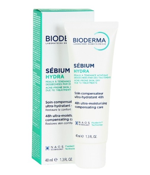Bioderma Sébium Hydra is an ultra-hydrating compensating care for acne-prone skin dehydrated by drying treatments. Nourishes and comforts the skin. Non-comedogenic.