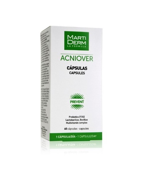 MartiDerm Acniover capsules balance the microbiota and strengthen the natural barrier of the epidermis, act as a sebum regulator and help eradicate pimples thanks to ingredients such as Niacinamide or prebiotics and probiotics.