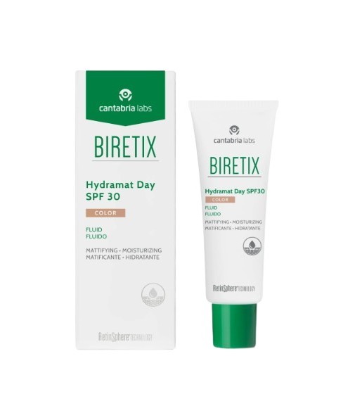 Moisturizing and mattifying facial fluid with SPF 30 sun protection and color, suitable for combination or oily skin.