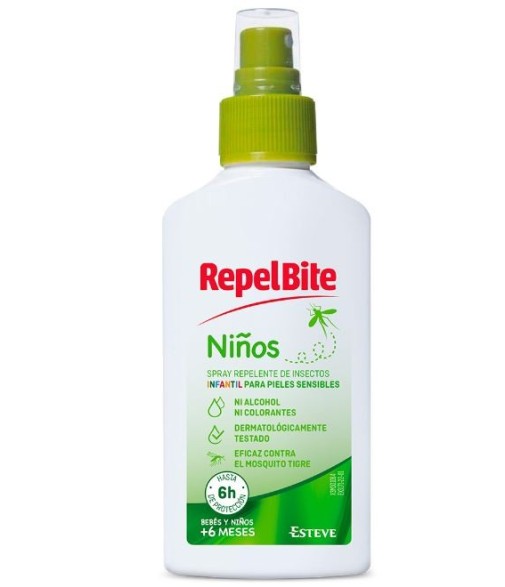 Repelbite children's repellent spray suitable for sensitive skin, alcohol-free, effective against tiger mosquitoes. Up to 6 hours of protection.