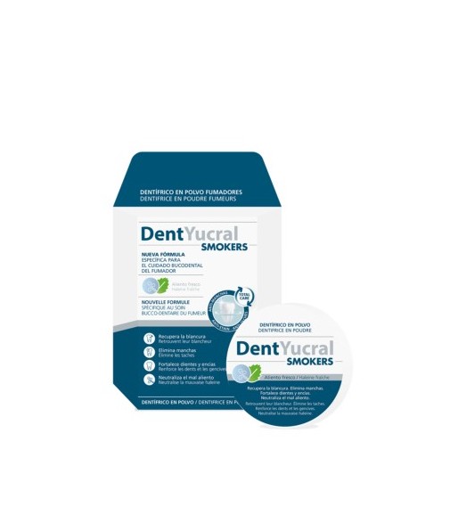 DentYucral Smokers is a powdered toothpaste for adults, indicated for the oral care of smokers. Composed of 0.8% sodium monofluor phosphate and 1,056 ppm fluoride ion, which keep teeth white and healthy, prevent the formation of stains and care for and strengthen gums. It also neutralizes smoker's breath, leaving a fresh and minty breath.