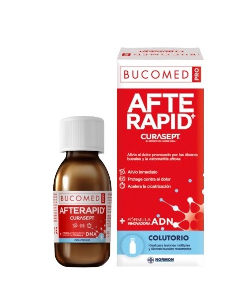 Colutorio bucal calmante que alivia el dolor y la irritación de la mucosa oral, indicado en aftas, lesiones leves y tras tratamientos dentales.