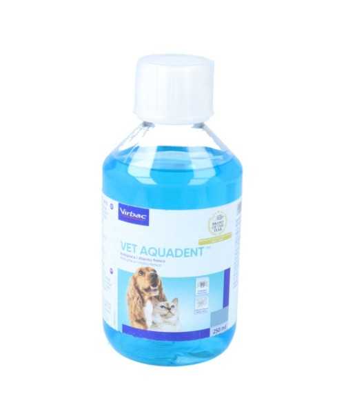 Solución para higiene bucal en perros y gatos, diluible en agua para reducir el mal aliento y la placa dental, previniendo sarro y enfermedades periodontales, con administración fácil al añadir 2,5 ml por cada 250 ml de agua.