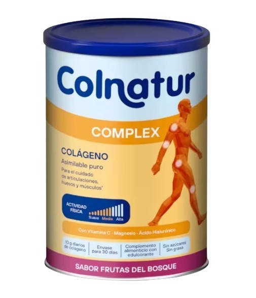 Colnatur Complex es un complemento alimenticio con sabor a frutas del bosque que ayuda al correcto funcionamiento de los cartílagos, gracias a la formación de colágeno, al mantenimiento de los músculos, a la protección y fortalecimiento de los huesos, así como a mejorar el aspecto de la piel.