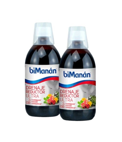 Bimanán Drenaje Reductor Ultra es un complemento alimenticio a base de concentrado de frutas y extractos vegetales de fucus, que ayuda a la pérdida de peso y a aumentar la sensación de saciedad, y zarzaparrilla que contribuye a las funciones digestivas y ayudar a la depuración del organismo.