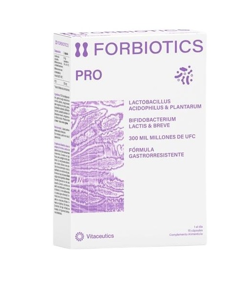 Forbiotics Pro 15 cápsulas es un suplemento probiótico de alta calidad que contiene una combinación de 15 cepas de bacterias beneficiosas para la salud intestinal. Estas cepas están especialmente seleccionadas para ayudar a mantener un equilibrio en la flora intestinal, promoviendo una mejor digestión y fortaleciendo el sistema inmunológico. Cada cápsula de Forbiotics Pro 15 garantiza una alta concentración de probióticos activos, lo que lo convierte en una opción ideal para mejorar la salud gastrointestinal. Este producto es apto para personas que buscan reforzar su flora intestinal, ya sea por problemas digestivos, después de tomar antibióticos o simplemente para cuidar su bienestar general. La presentación en cápsulas facilita su consumo diario y su fórmula de liberación controlada asegura la máxima efectividad de los probióticos. Con Forbiotics Pro 15 cápsulas, podrás disfrutar de los beneficios de un sistema digestivo saludable y fortalecer tu sistema inmunológico de manera práctica y eficaz.