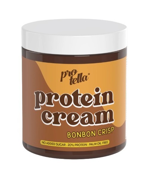Protella Crema BonBon Crisp 250 g es una crema para untar basada en proteínas de leche y pasta de avellana, formulada para ofrecer una alternativa con mayor aporte proteico frente a cremas de cacao convencionales. Contiene aproximadamente un 20% de proteína total, con un 12% de proteína de leche declarada, y fragmentos crujientes de avellana y almendra que aportan textura. La formulación prescinde de azúcares añadidos y de aceite de palma, sustituyendo parte de los azúcares por maltitol y empleando aceites vegetales de girasol y grasas vegetales (coco, karité) para la estructura y palatabilidad.