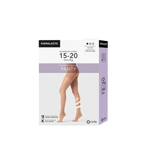 Farmalastic Panty Compresión Ligera (15-20mmHg), color Camel,Talla L. Está diseñada para aliviar las piernas cansadas, la pesadez, los tobillos ligeramente hinchados y como medida preventiva de las arañas vasculares.