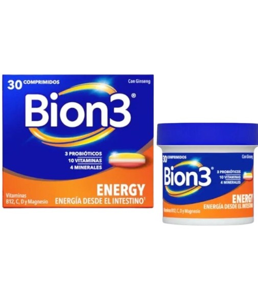 Bion3 energy, está indicado para adultos (+18 años) que necesiten un aporte de energía extra. Formulado con 3 probióticos que llegan vivos al intestino, 10 vitaminas y 4 minerales, vit B1, B2, Niacina (vit B3), Ácido pantoténico (vit B5), vit B6, Biotina (vit B7), Ácido fólico (vit B9), vit B12, vit C, vit D, Magnesio, Hierro, Zinc, Yodo y Extracto de Ginseng, que contribuyen al metabolismo energético normal y al normal funcionamiento del sistema inmunitario, disminuyen el cansancio y la fatiga y tienen una liberación prolongada de vitaminas durante 6 horas para tener energía durante el dia.