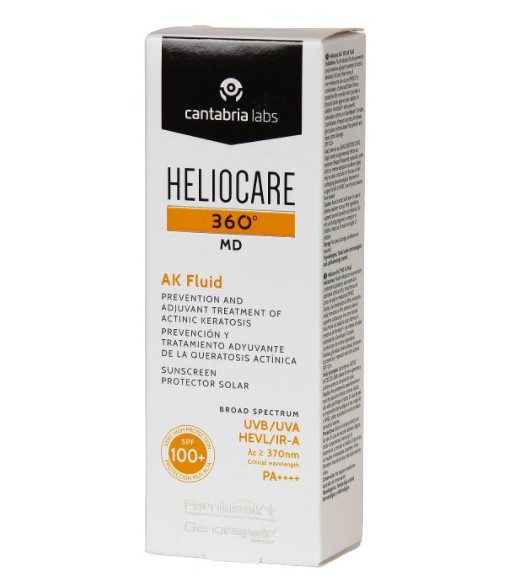 Indicado para todo tipo de pieles, el fluido MD AK Fluid 360º de Heliocare actúa mediante una barrera que forma el fluido frente a los daños solares, previniendo la aparición de la queratosis actínica y tratando los ya existentes, además de proporcionar un acabado invisible y, gracias a las tecnologías Fernblock®+ y GenoRepair Complex, un efecto antioxidante acompañado de la reparación y protección de la piel frente a las acometidas del sol.
